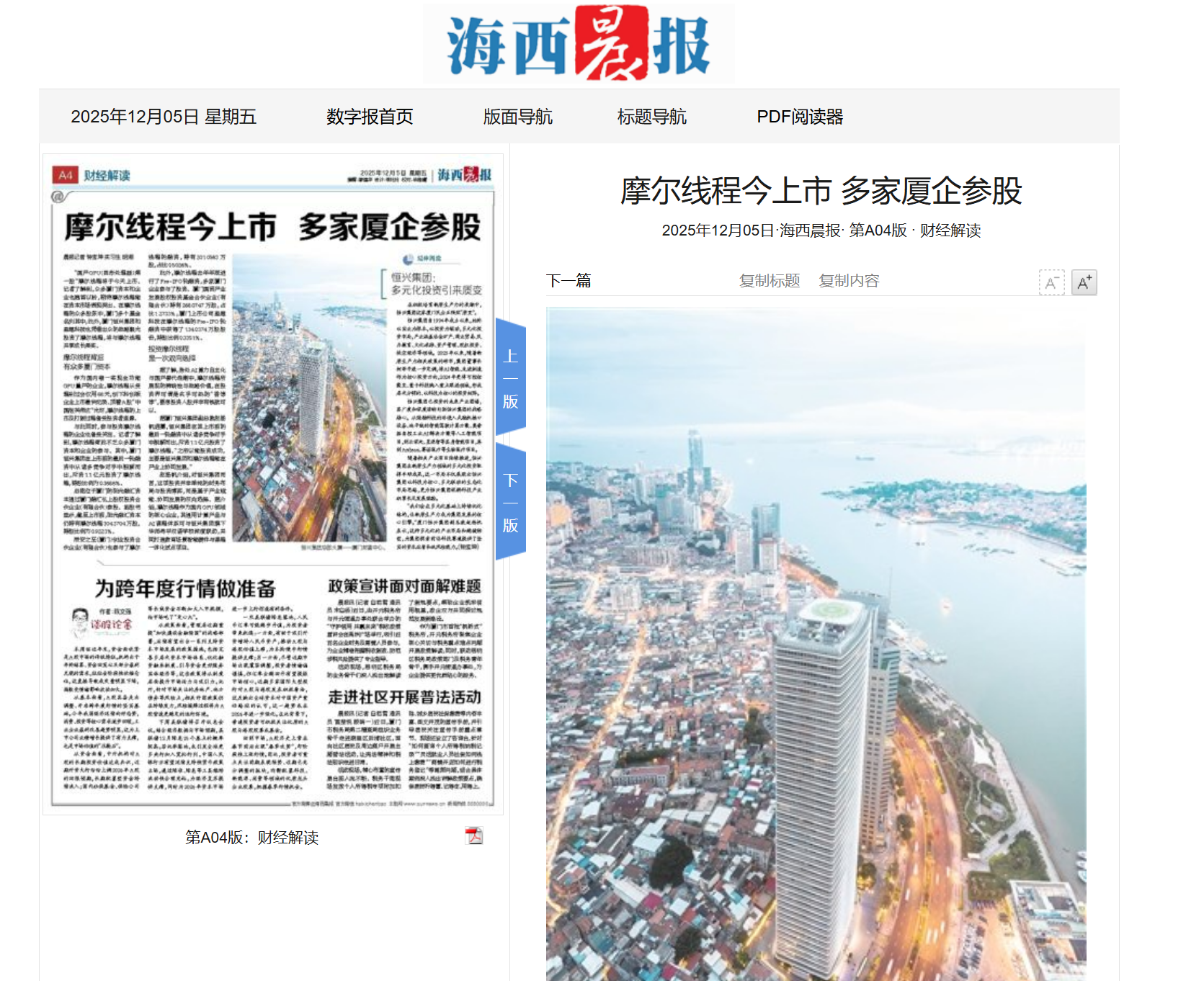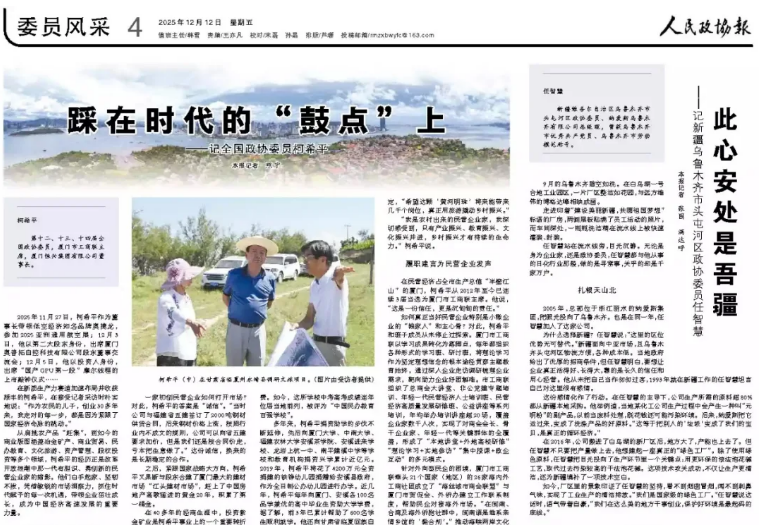 【人民政協(xié)報(bào)】2025年12月12日,人民政協(xié)報(bào)專訪柯希平文章《踩在時(shí)代的“鼓點(diǎn)”上》,刊登于第4版“委員風(fēng)采”欄目,照寧記者手記《致敬民營企業(yè)家,致敬奮斗者》同步刊登??孪F剑旱谑?、十三、十四屆全國政協(xié)委員,廈門市工商聯(lián)主席,廈門恒興集團(tuán)有限公司董事長。2025年11月27日,柯希平作為董事長帶領(lǐng)低空經(jīng)濟(jì)知名品牌奧捷龍,參加2025亞洲通用航空展;12月3日,他以第二大股東身份,出席廈門奧普拓自控科技有限公司股東董事交流會;12月5日,他以投資人身份,出席“國產(chǎn)GPU第一股”摩爾線程的上市敲鐘儀式……在新質(zhì)生產(chǎn)力賽道加速布局并收獲頗豐的柯希平,在接受記者采訪時(shí)樸實(shí)地說:“作為農(nóng)民的兒子,創(chuàng)業(yè)30多年來,我走對的每一步,都是因?yàn)榫o跟了國家經(jīng)濟(jì)命脈的跳動(dòng)?!睆募缣艮r(nóng)產(chǎn)品“趕集”,到如今的商業(yè)版圖涵蓋冶金礦產(chǎn)、商業(yè)貿(mào)易、民辦教育、文化旅游、資產(chǎn)管理、股權(quán)投資等多個(gè)領(lǐng)域,柯希平的經(jīng)歷正是改革開
