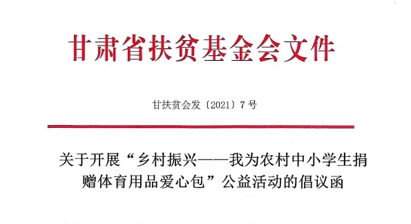 “鄉(xiāng)村振興—我為農(nóng)村中小學(xué)生捐贈(zèng)體育用品愛心包”是由甘肅省扶貧基金會(huì)發(fā)起的全省內(nèi)為偏僻鄉(xiāng)村中小學(xué)留守兒童捐贈(zèng)基礎(chǔ)體育器械和益智用品的公益活動(dòng)。以促進(jìn)全省農(nóng)村義務(wù)教育階段學(xué)生及留守兒童健康成長(zhǎng)為宗旨,積極引導(dǎo)動(dòng)員社會(huì)力量為全省偏遠(yuǎn)山區(qū)和農(nóng)村中小學(xué)生捐贈(zèng)“體育用品愛心包”,切實(shí)提高甘肅省“偏遠(yuǎn)山區(qū)、寄宿學(xué)?!绷羰貎和暗隆⒅?、體”全面發(fā)展,改善農(nóng)村中小學(xué)生體育用品的匱乏現(xiàn)狀。