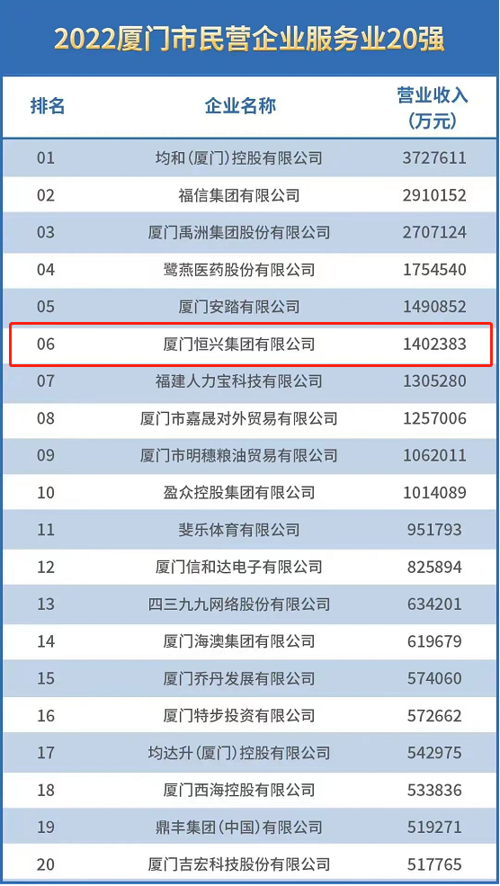 廈門恒興集團(tuán)有限公司入榜“2022年廈門市民營企業(yè)百強”,位居榜單第10位;入榜“2022廈門市民營企業(yè)服務(wù)業(yè)20強”,位居該榜第6位。??