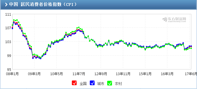 從下圖可以看到,國內(nèi)CPI指數(shù)自2011年開始下滑,近年來走勢穩(wěn)定,進入2017年又有小幅下滑。這在一定程度上會限制消費類黃金的需求。
