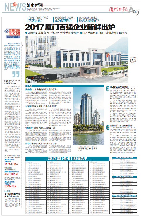 ?? ? ? 近日,由廈門企業(yè)和企業(yè)家聯(lián)合會、廈門日報社、廈門廣電集團聯(lián)合主辦,各行業(yè)協(xié)會協(xié)辦的“2017廈門企業(yè)100強”排序活動,歷經(jīng)2個多月的嚴格評選,已圓滿落幕。2017廈門百強企業(yè)排行榜掀開面紗,三個榜中榜——“2017廈門制造業(yè)企業(yè)十強”排行榜、“2017廈門服務(wù)業(yè)企業(yè)十強”排行榜以及“2017新興產(chǎn)業(yè)專精特新企業(yè)十強”排行榜也同步揭曉。