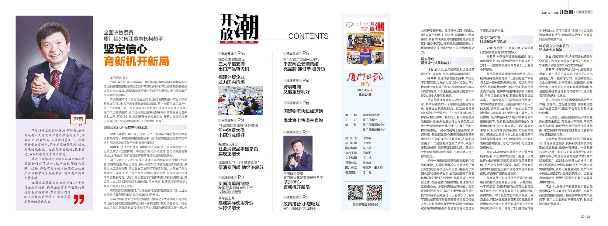 作為福建本地大型民營(yíng)企業(yè)代表,廈門恒興集團(tuán)一方面積極踐行社會(huì)責(zé)任,全力開(kāi)展支援抗疫捐款捐物,另一方面在復(fù)工復(fù)產(chǎn)中按下“快進(jìn)鍵”,實(shí)干擔(dān)當(dāng)作表率,全力挽回疫情帶來(lái)的經(jīng)濟(jì)損失。廈門市工商聯(lián)主席、廈門恒興集團(tuán)董事長(zhǎng)柯希平日前在接受記者采訪時(shí)表示,后疫情時(shí)期,我們更要堅(jiān)定發(fā)展信心,要努力實(shí)現(xiàn)習(xí)總書(shū)記所提出的“在危機(jī)中育新機(jī)、于變局中開(kāi)新局”。